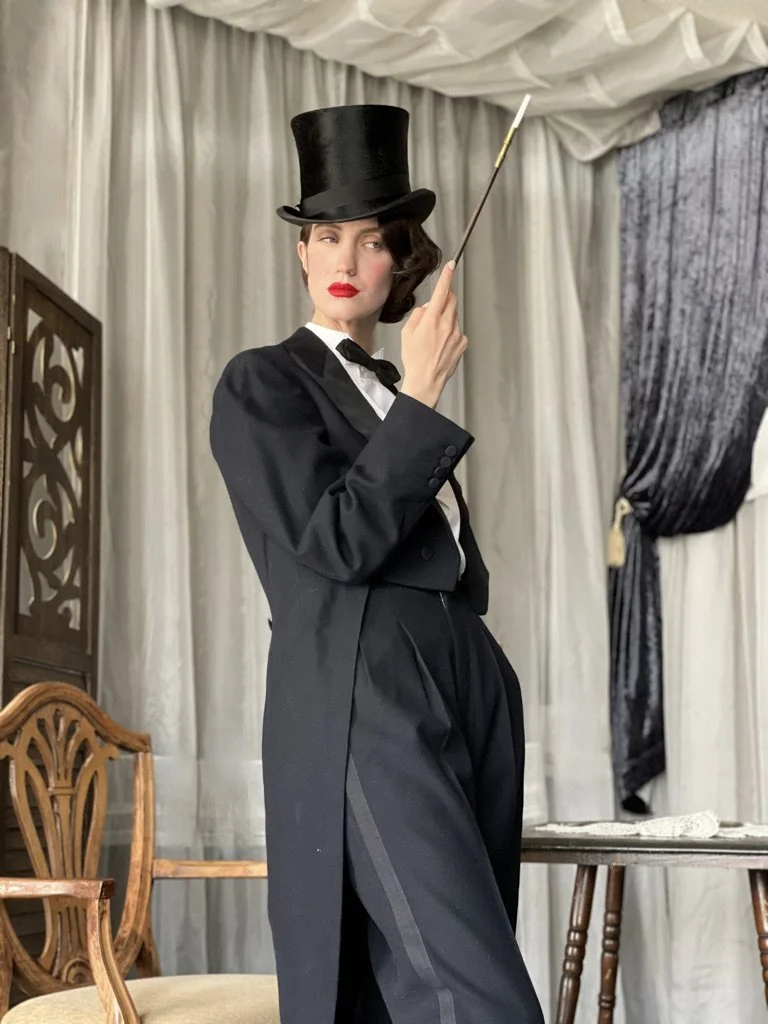 Marlene Dietrich was one of the many actresses in the 1930s who embraced the men’s pantsuits, thus set a style for an entire generation. This beautiful vintage tuxedo was gifted to me by a friend and is in excellent condition, probably worn once or twice then packed away only to be brought into the light some 100 years later. I already had the vintage top hat and shoes in my collection. The only newer items, still vintage, are the shirt and tie. The quellazaire (cigarette holder) is on loan from my husband’s collection of tobacconalia.